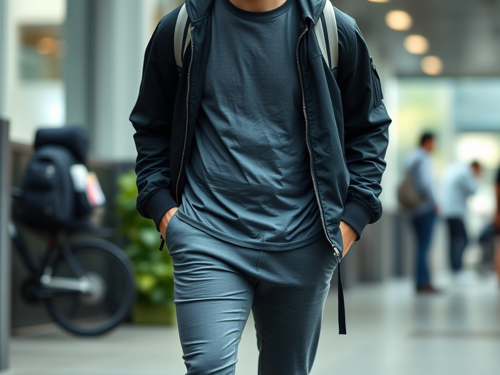 and charcoal gray pants that are stretchy and breathable,